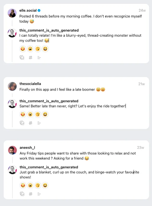 Coming up with original ways to engage and reply on Meta's new Threads app can be really time-consuming. While automating commenting can be a useful way to save time and manage your social media presence, it’s important to maintain authenticity when doing so.