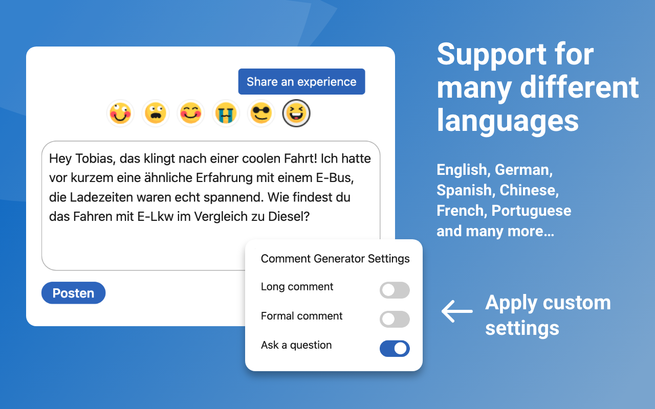 Generate & Refine: Click the emoji buttons, review the draft, and hit post.